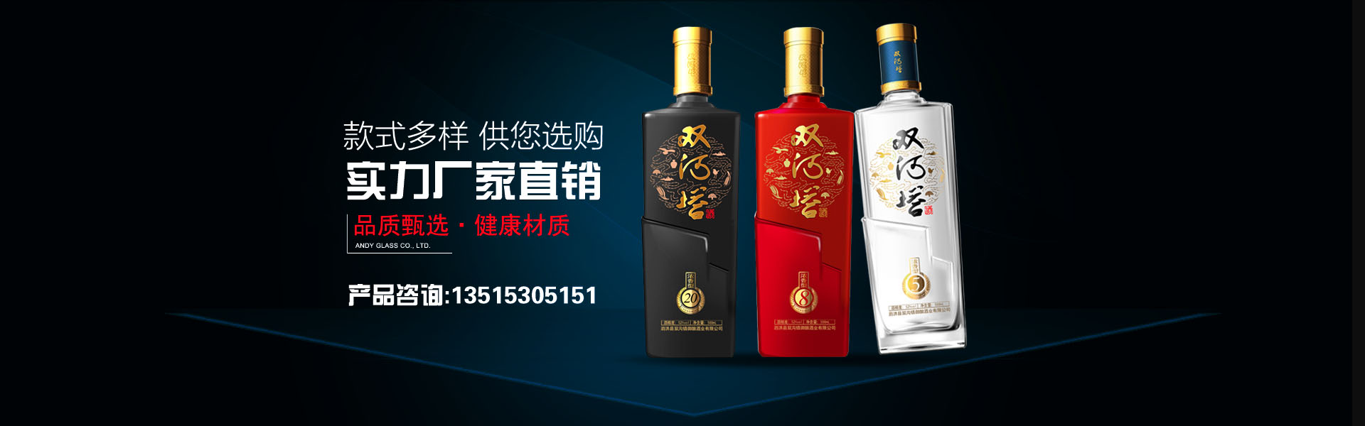 公司主要生產經營高白瓶、晶白料酒瓶、茶油瓶、噴涂瓶、電鍍瓶、小酒瓶等玻璃瓶系列。我公司生產的玻璃瓶品種多、質量好、價格低,不但可以在短時間內設計出新瓶型及制成新模具,并且還可以根據客戶的需求來進行設計制作,使得我公司的玻璃瓶產品受到市場的一致青睞。